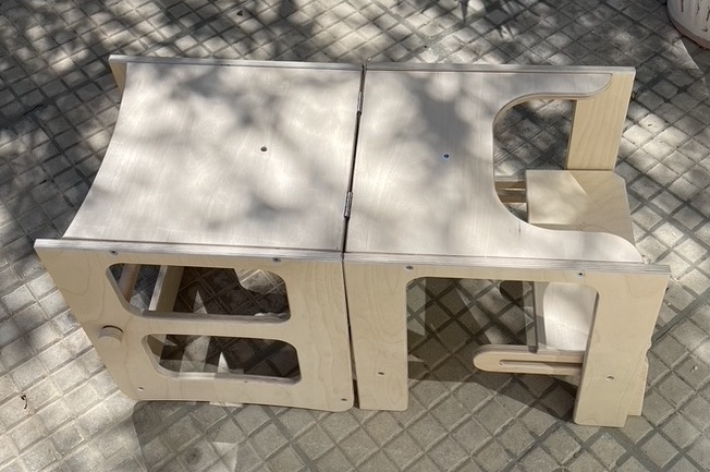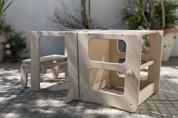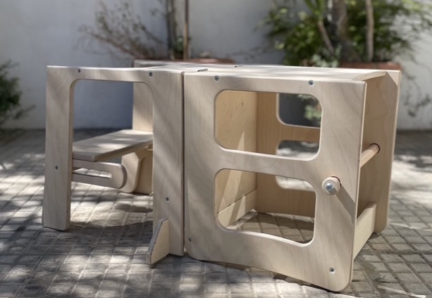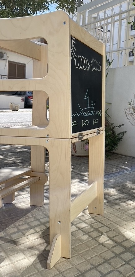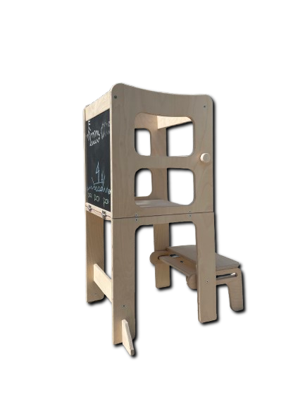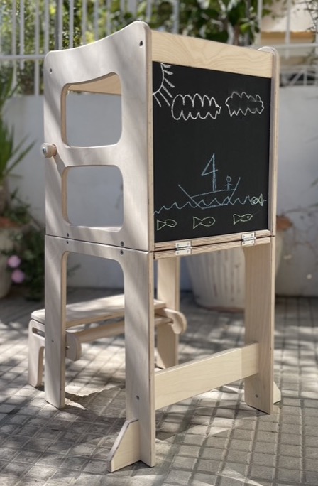 Πύργος Εκμάθησης 3 σε 1 τραπέζι καρέκλα με μαυροπίνακα, Φυσικό ξύλο Montessori.